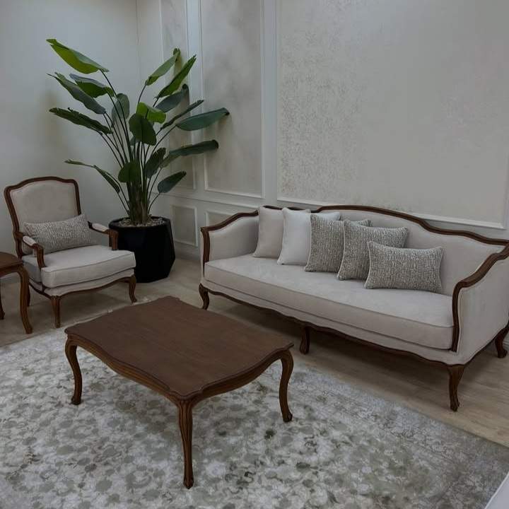 The sofa frames feature hand carved wooden arms, legs, and back panels that showcase traditional Chinoti detailing. Upholstery options include premium fabric, velvet, and leatherette in a wide range of colors and textures. Cushions are crafted to provide balanced comfort while maintaining shape over time.
